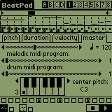 Tap on the forth tab to see the master controls. These controls are constant as you change from pattern to pattern, but are saved as preferences so that BeatPad will remember where you set these. You can set the tempo, MIDI instruments for both the melodic and drum parts, and the center pitch. When performing with BeatPad you can be sure that changing patterns won't suddenly change the speed or key of the music being played, and you can change instruments whenever you want (which won't always be when the patterns change). The first slider sets the tempo that BeatPad plays at. This can be a range from 40 to 240 beats per minute. A beat is defined as four steps of a pattern. As you move this slider (you can drag it, or simply tap the new position you want) the number of beats per minute is displayed to the right, and playback responds to the change immediately. The slider moves by increments of two beats per minute, but the arrows to either side can move a single BPM at a time. Next down are sliders for the Melodic and Drum MIDI programs. MIDI program changes are how the instrument or sound generated by the MIDI hardware are changed. There are 128 values available, and on a General MIDI (industry standard) device these sounds range from various pianos, guitars, and violins to oboes, trumpets, and even gunshots. These sliders work the same as the tempo, and when MIDI is turned on, program changes will be sent whenever these sliders move, whether BeatPad is playing or not. Below all the sliders is a small keyboard where you can select the "center pitch". Any pattern being played will be transposed to this center pitch (it will be used as the pitch value for the center position of the pitch controls when the octave control is also in its center position). The small arrows on either side let you move up and down octaves (the ocatave number appears to the lower left of the keyboard) giving you a ten octave range (from -2 to 7). These arrows move the octave you are looking of the keyboard, but you must still tap the keyboard to move the center pitch. Setting very low or high center pitches may put notes of some patterns out of the playable range; such notes will be moved by octaves until they are insdie the range (pitch will be kept the same, only the octave will change). | ![]() Tab 4 - Master Controls |