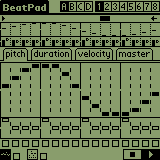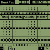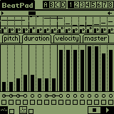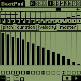 BeatPad will open in the melodic view. Across the top (to the right of the "BeatPad" title bar) are the letters and numbers representing the 32 patterns you can work with. Just below the title bar is the pattern "overview". In the overview you can see every aspect of a pattern. As we go through the following screens, watch how the overview mirrors the controls below. There are 16 steps in a pattern; both the overview and controls below are devided into 16 columns, one for each step. Dotted lines seperate the steps, and solid lines seperate the four beats. The top portion of the overview has dashes/lines for each step, representing the pitch (higher on the screen means a higher pitch), and the length of each line represents the duration. VERY short notes may show up as a single pixel, while a note that is tied to the next (longer than one step) will be a very long line touching the seperators between the steps. The bottom half of the overview has two parts for each step, on the left is a small solid bar graph representing the 'velocity' of each step. Velocity refers to how "hard" a note is struck, but you can think of it as volume. The taller the bar is, the louder the note will sound. On the right is a small 'octave' indicater. A pattern can cover a range of 5 octaves, and this open pointer will move up and down depending on what octave the step is set to (more on this below). |